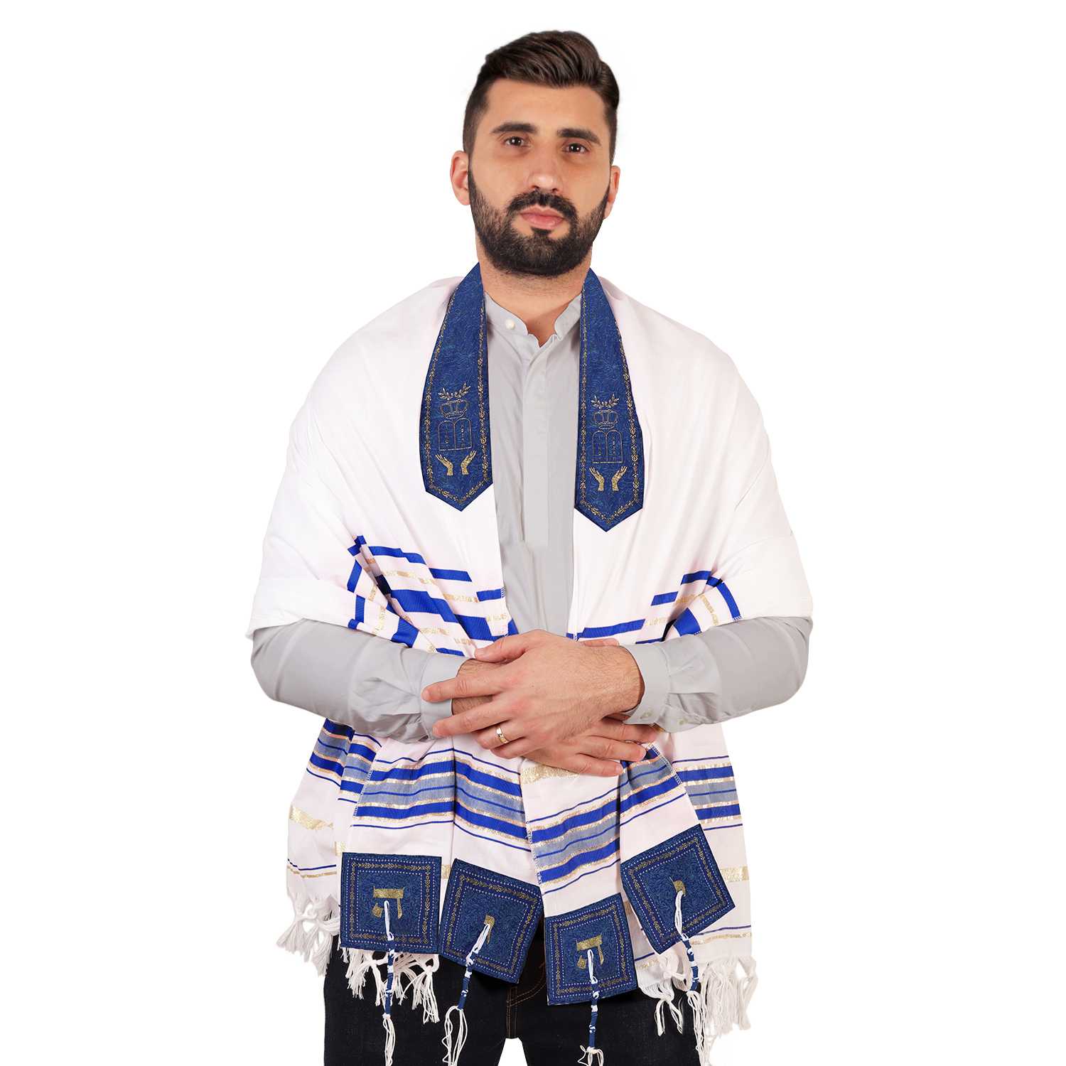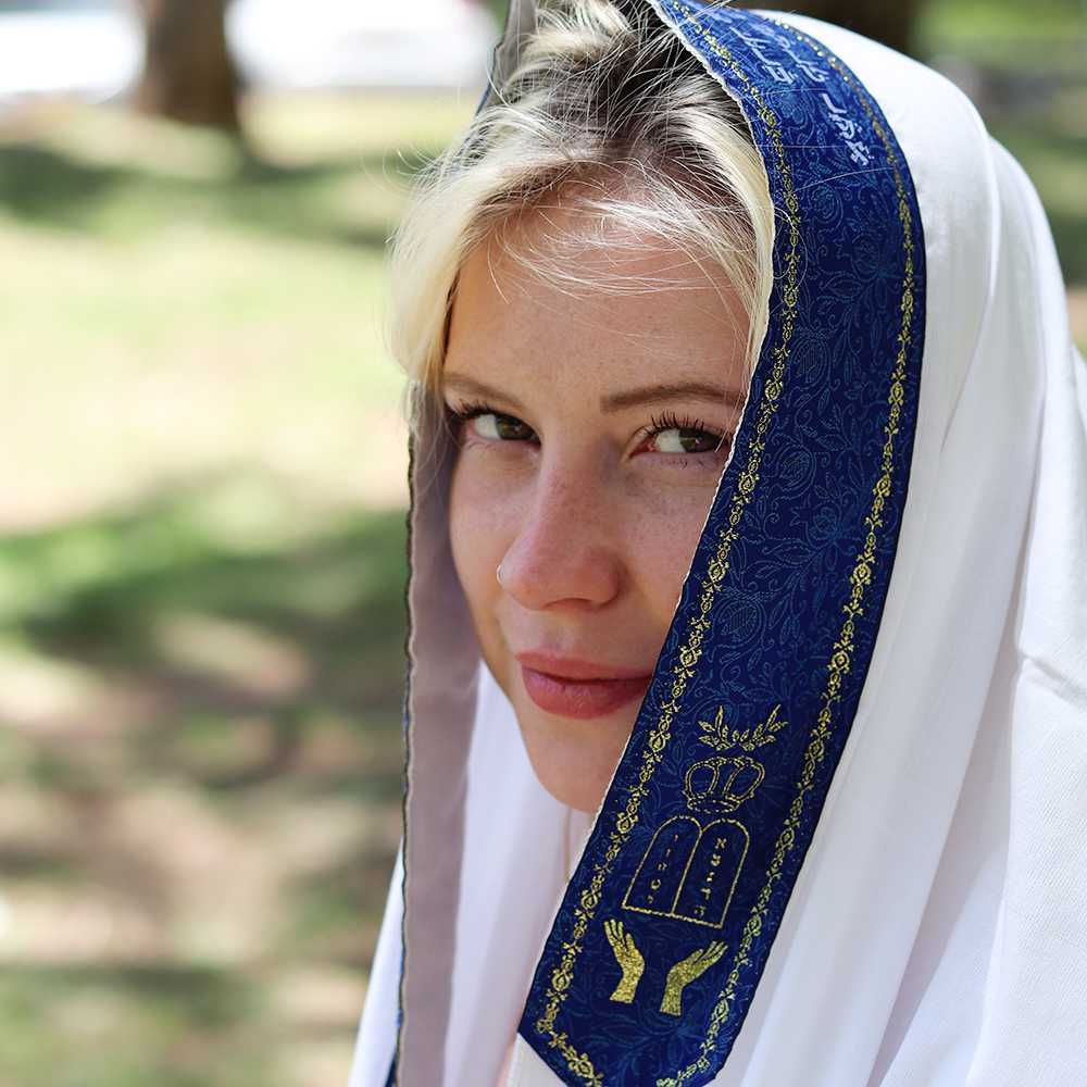 - HEBREW BLESSINGS AND TRADITIONAL SYMBOLS - Designed in Israel, this Jewish prayer shawl for women and men has the Hebrew blessing of the prayer shawl on the collar. On this same collar there are symbols of the pomegranate, an ancient fruit symbolizing fertility, and abundance, the 10 Commandments and hands reached out in prayer.